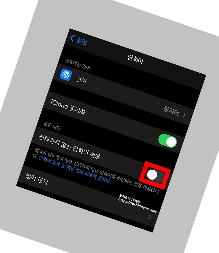 공유 보안에 보면 '신뢰하지 않는 단축어 허용'이 있는데~ 방금전에 작업을 하셨다면? 이렇게 사용자가 동그라미 버튼을 이동시킬 수가 있습니다. 오른쪽으로 이동을 시켜 기능을 활성화를 시켜주면?