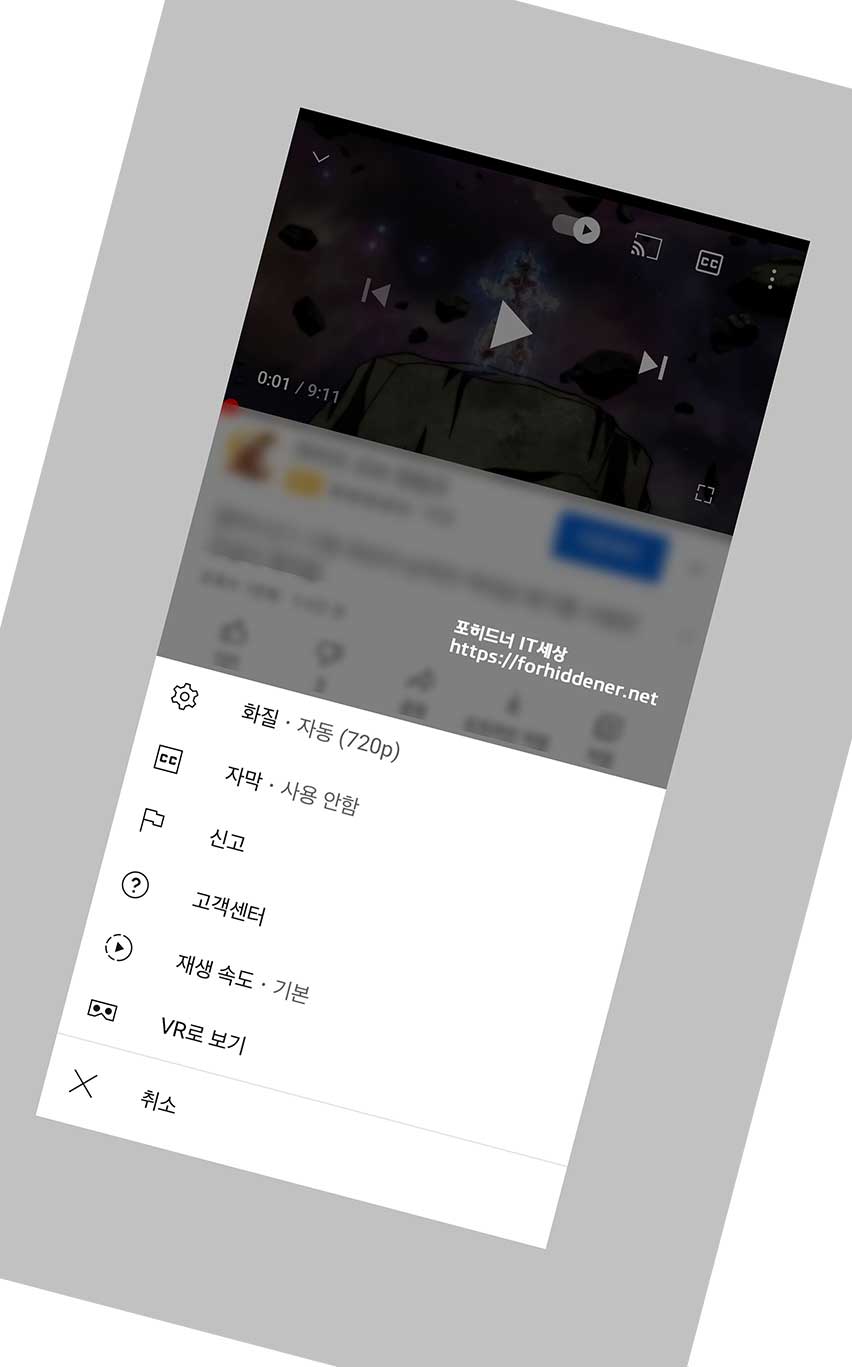 기본적으로 PIP 기능을 사용할 수가 없는데요~ 사진과 같이 (화질, 자막, 신고, 고객센터, 재생 속도, VR로 보기) 메뉴만 나오고 위에는 자동재생 , 자막 버튼등이 있습니다.