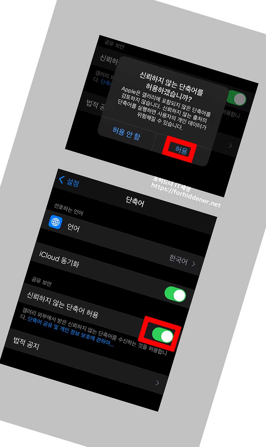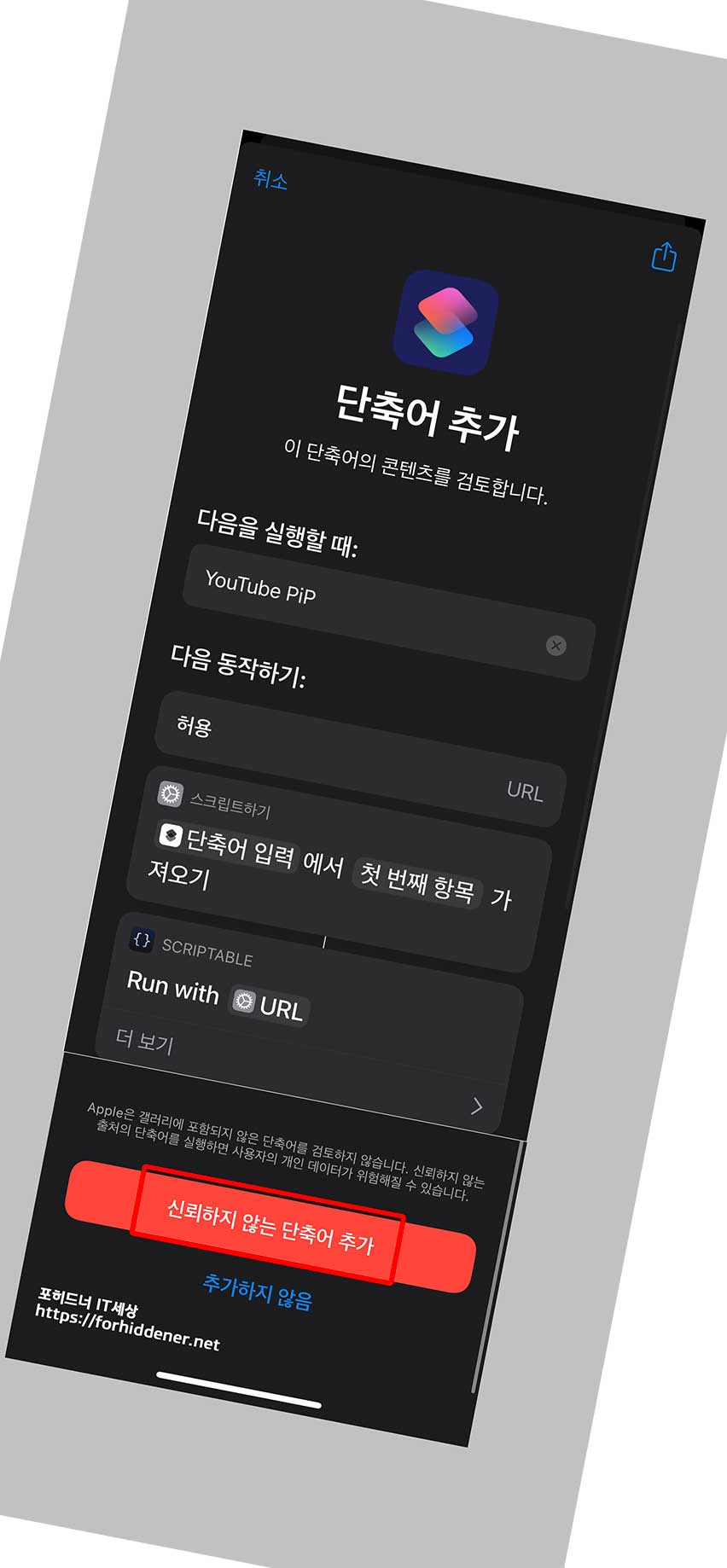 신뢰하지 않는 단축어를 허용하겠습니까?