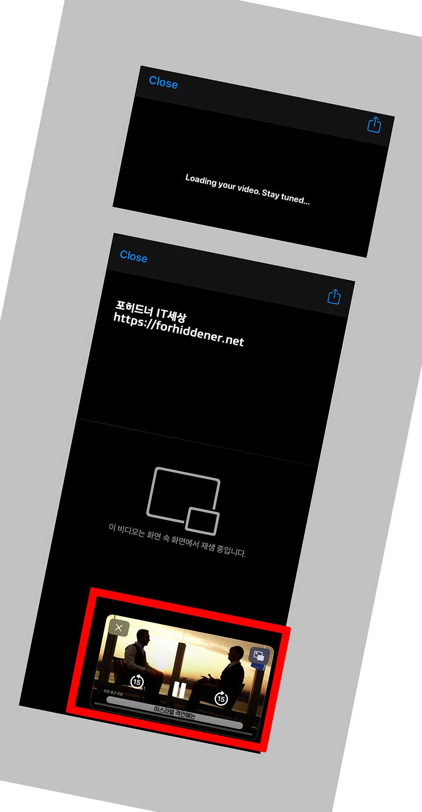잠시후에 아래와 같이 '이 비디오는 화면 속 화면에서 재생 중입니다.' 라는 문구가 나오고 5시 방향에 보면 아이폰 유튜브 작은화면 영상이 보일 것입니다. 이렇게 나온다면 성공입니다. 이제 좌측에 Close 닫기를 누르지 않고 iPhone 손가락을 이용해 멀티태스킹을 하면 됩니다. 이 앱을 활성화 시킨 상태에서 하셔야 합니다.