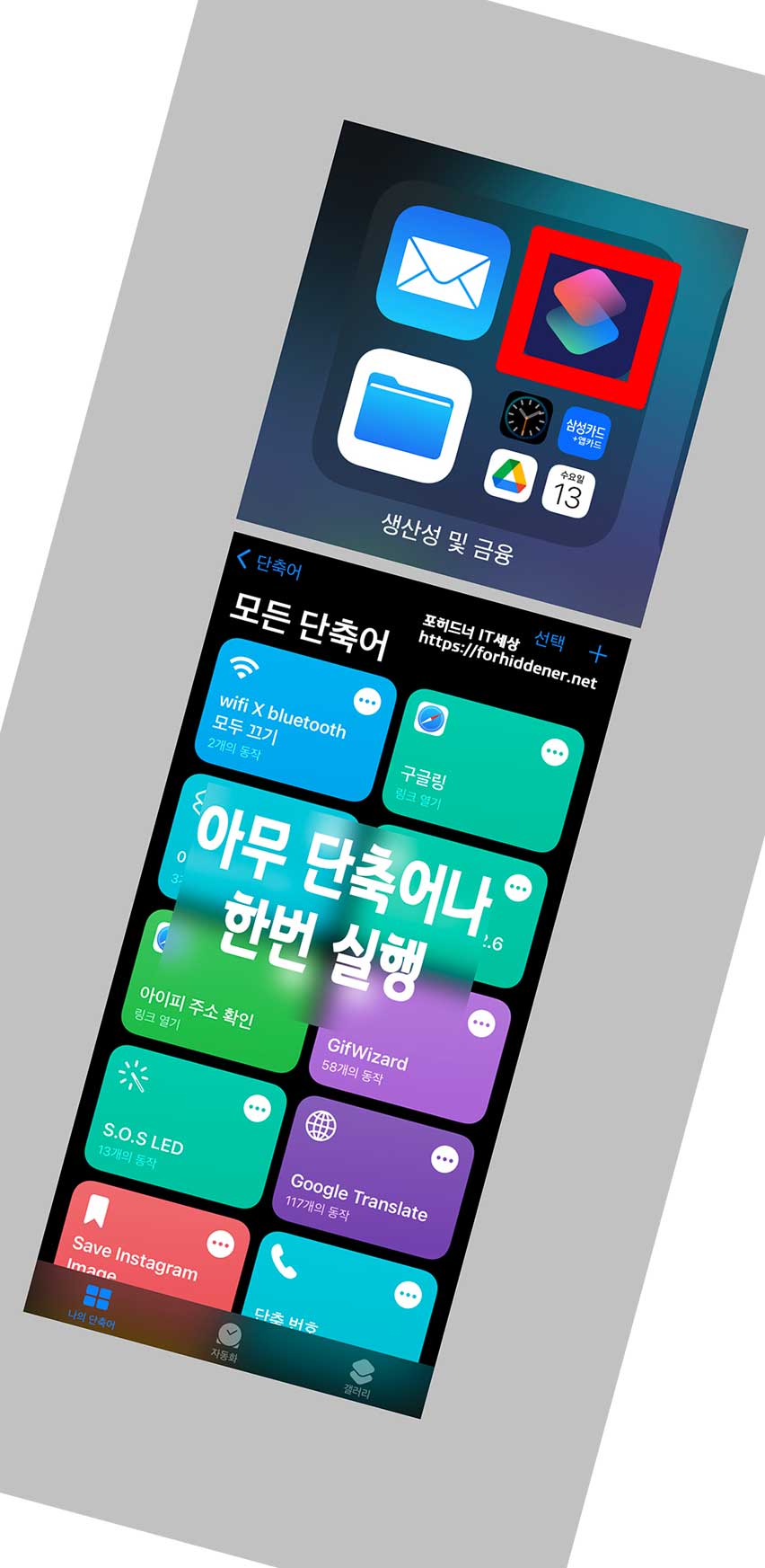 설정에 단축어 앱에서 [공유 보안]에 신뢰하지 않는 단축어 허용 을 해야하는데, 기본 설정에서는 사용자가 해당 기능을 활성화시킬 수가 없게 되어있기 때문에 위 사진과 같이 단축어 앱에 들어가서 임의의 단 축 어 앱을 한번 실행을 시켜줘야 합니다.