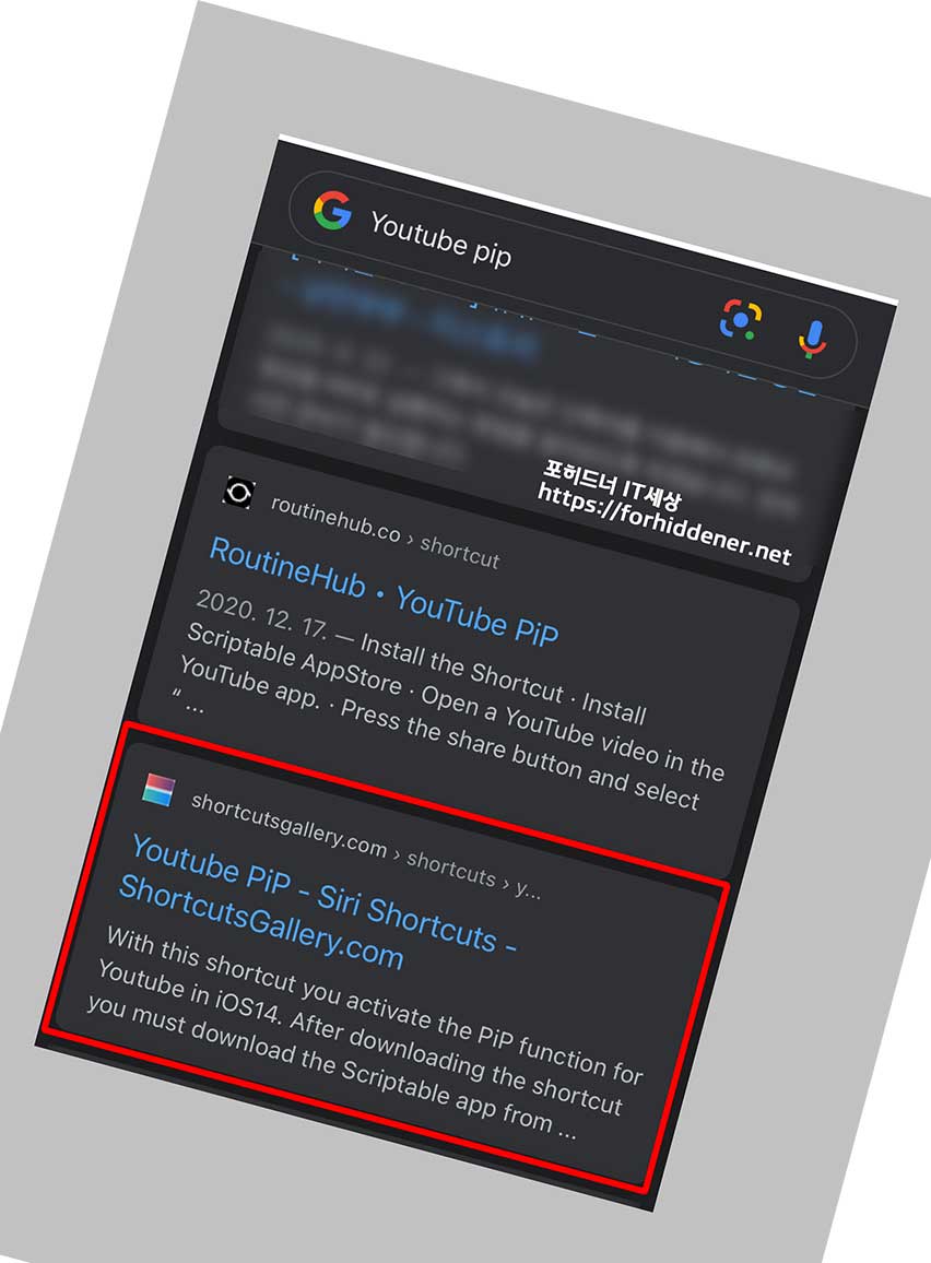 아이폰 유튜브 작은화면 멀티태스킹 기능을 사용하기 위한 모든 준비를 마치신 상태입니다. 이제 단축어 앱 소스를 받아야 하는데요~ 직접 사진과 같이 구글에서 YouTube PIP 라고 검색을 하시거나 (바로가기)를 통해 쇼트컷갤러리 공식 사이트에 YouTube PiP 에 접속을 합니다.
