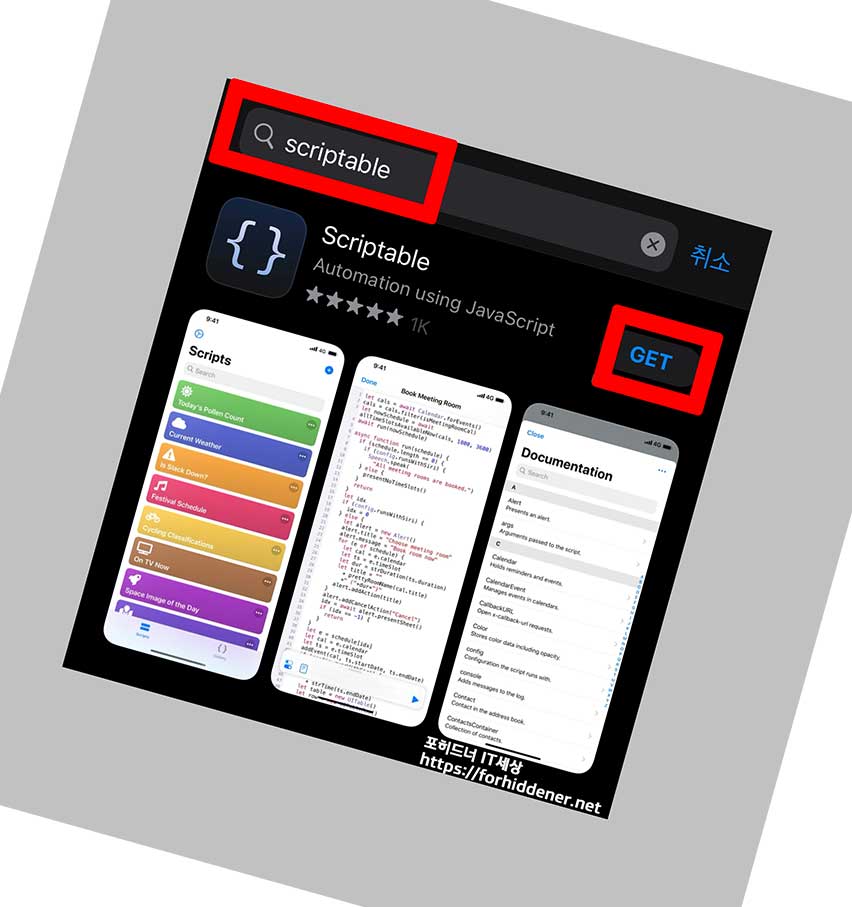 사진과 같이 영문으로 scriptable 이라고 입력을 하시거나 (바로가기) 를 통해 스크립터블 앱을 설치합니다. GET 을 Click
