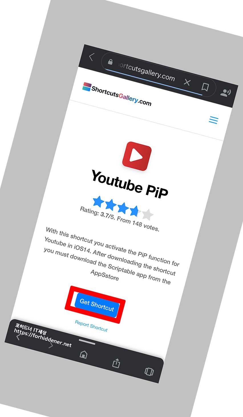 아이폰 유튜브 작은화면 멀티태스킹 기능을 사용하기 위한 모든 준비를 마치신 상태입니다. 이제 단축어 앱 소스를 받아야 하는데요~ 직접 사진과 같이 구글에서 YouTube PIP 라고 검색을 하시거나 (바로가기)를 통해 쇼트컷갤러리 공식 사이트에 YouTube PiP 에 접속을 합니다.
