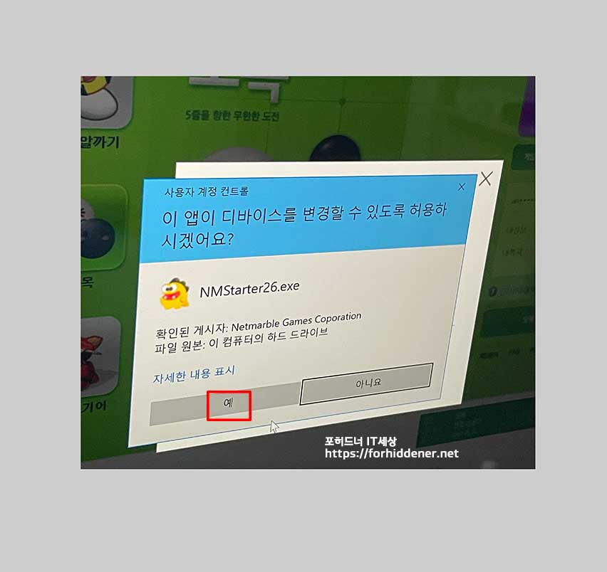 사용자 계정 컨트롤 창이 다시 뜨고 익숙한 공룡 아이콘이 화면에 보일 것입니다. NMStarter26.exe 아래에 [예]를 누릅니다.