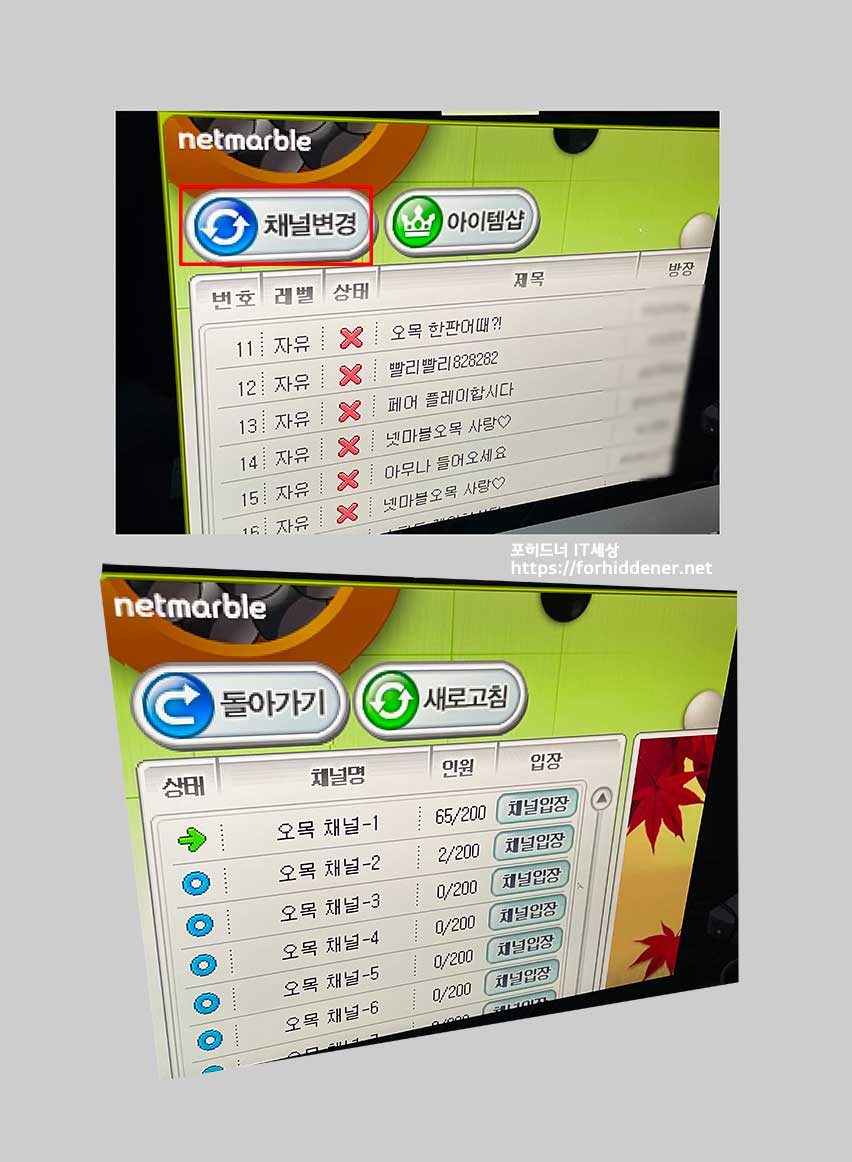 상태 X 라고 적혀있는곳은 방에 참여가 불가능하기 때문에 [채널변경]을 누르면? 접속가능한 방들이 나옵니다. 직접 방을 만드시려면?