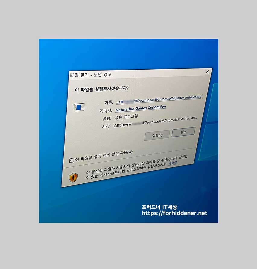 파일 열기 - 보안 경고 창이 뜨며 이 파일을 실행하겠냐고 묻는 창이 뜹니다.