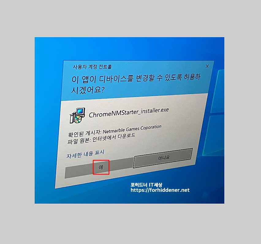 이어서 나오는 화면에서는? 사용자 계정 컨트롤 디바이스 변경할 수 있도록 허용하겠냐는 문구가 나오면? 예를 Click 합니다.
