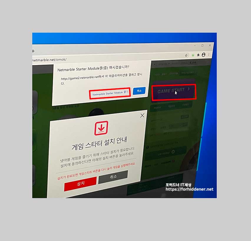 방금전에 스타터 프로그램을 설치했는데, Game이 자동으로 실행이 되지 않습니다. 사용자가 Netmarble omok 공식 사이트에 들어가셔서 보라색 박스 Game Start 를 클릭해주셔야 하는데요~ 게임 스타트 를 누르면? 아까와 같이 스타터 설치 안내 문구가 또 뜨는데, 이건 그냥 무시를 해줍니다. 위에 있는 Netmarble Starter Module을(를) 여시겠습니까? 문구 아래에 "넷마블 스타터 모듈 열기" 를 Click 합니다.