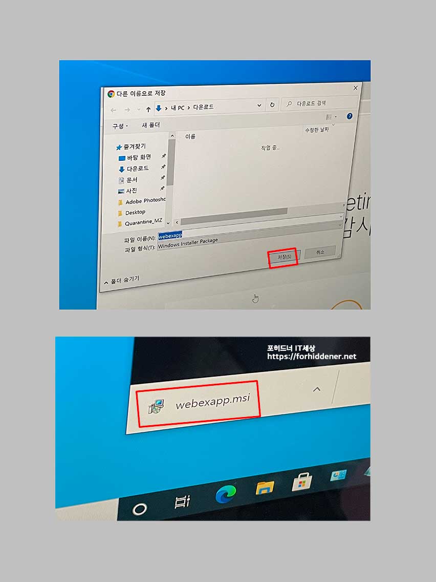 다른 이름으로 저장 창이 뜨며 [저장]을 Click 하면? 브라우저 하단쪽에 W e b e x app.msi 설치파일을 내려받을 수 있습니다. 설치를 진행하시려면? 아이콘을 마우스로 한번 Click 해주시면 인스톨을 진행할 수 있습니다.