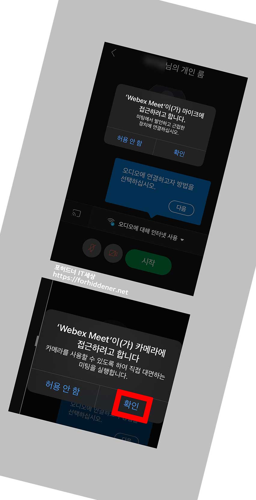 webex 사용법 - 처음에는 웹엑스 가 마이크에 접근하려고 합니다. 카메라에 접근하려고 합니다. 라고 메시지가 뜨면? 모두 [확인]을 Click해주셔야 캠, 목소리 음성이 들어가게 됩니다. 데스크톱 PC에서 접속시 주의점이라면? 노트북의 경우에는 웹캠이 기본 내장되어 있어서 별도의 입력외부장치가 필요가 없지만, 조립식 PC 데스크톱을 사용중이시라면? 웹캠, 마이크, 헤드폰, 스피커가 있어야 정상적으로 화면이 나오며, 목소리 음성이 들리게 됩니다.