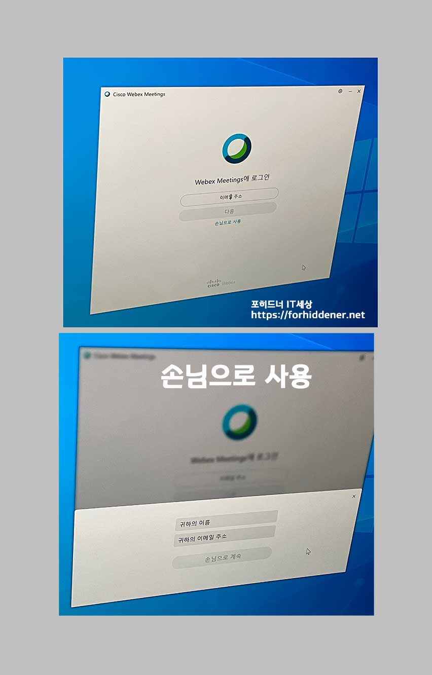 위와 같이 Cisco 웹엑스 프로그램이 자동 실행이 되면서 기본 화면이 나옵니다. 회의방에 참여를 하시는 게스트 는? 회원가입을 하지 않더라도 방에 참여를 할 수 있으며, 호스트 (주인)의 경우에는 회원가입을 하신 후에 방을 예약해서 만드셔야 합니다. '손님으로 사용' 을 누르면? 귀하의 이름 (접속자의 실명 또는 가명), 귀하의 이메일 주소를 입력해주시면 되겠습니다.
