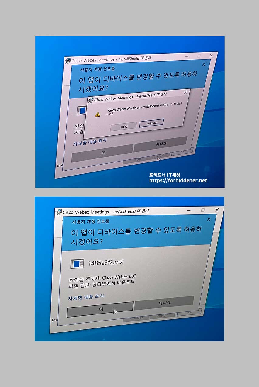 웹엑스 프로그램 설치하는 과정중 사진과 같이 '사용자 계정 컨트롤' 에 인스털쉴드마법사를 취소하시겠습니까? 라고 창이 뜨면 아니요를 Click 하신 후에 이어서 이 앱이 디바이스를 변경할 수 있도록 허용하시겠어요? 에서 나오는 1485a3f2.msi 창이 뜨면 [예]를 Click합니다.