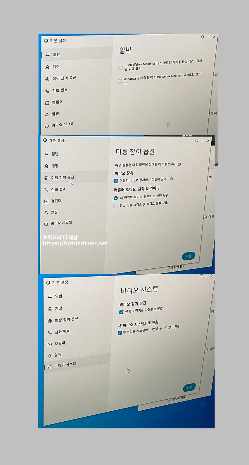 미팅 참여 옵션, 비디오 시스템 항목을 Click하면? 비디오 장치, 컴퓨터 오디오, 전화 및 카메라 관련 설정 부분이 있습니다. 가상회의 프로그램을 사용하면서 가장 기본적이면서 중요한 부분이 오디오 및 카메라 (웹캠)이 제대로 나오는지 여부가 중요한데요~ 이곳에서 관련 부분을 설정할 수 있습니다.