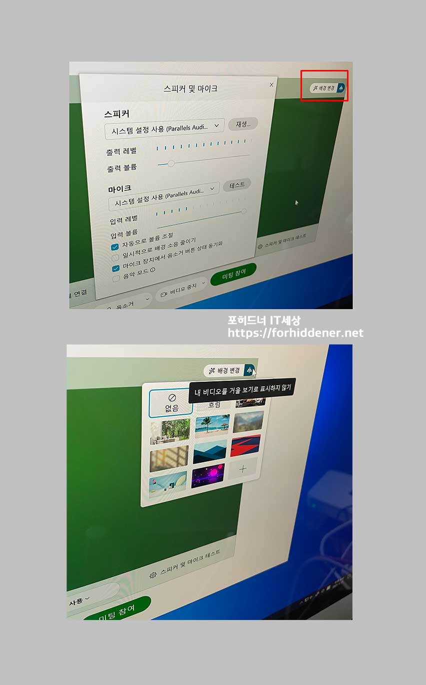 스피커의 출력 볼륨을 올려주시고, 출력 레벨에 사진과 같이 파란색으로 출력이 들어오는지 테스트를 해주시면 되겠습니다. 스피커와 마이크를 동시에 봐주시고요~ 이상이 없다면? X를 누르고, 사용자가 원한다면? 배경화면 아이콘을 눌러 내 비디오를 거울 보기로 표시하지 않기를 할 수 있으며 배경을 사용자가 지정할 수가 있습니다.