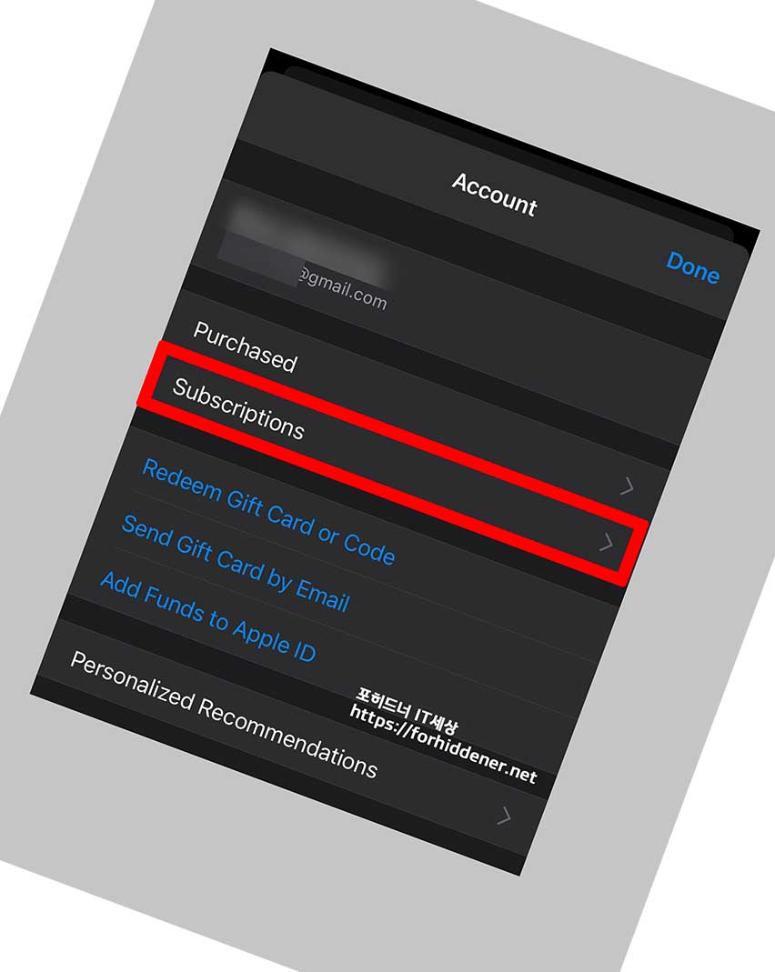 Account 계정에 보면? 영문으로 Purchased 구입내역이 있고, 아래에 보면 Subscriptions 구독 항목이 보일 것입니다. 찾으셨다면? Subscriptions 를 Click 합니다.