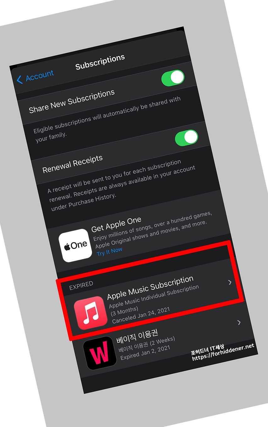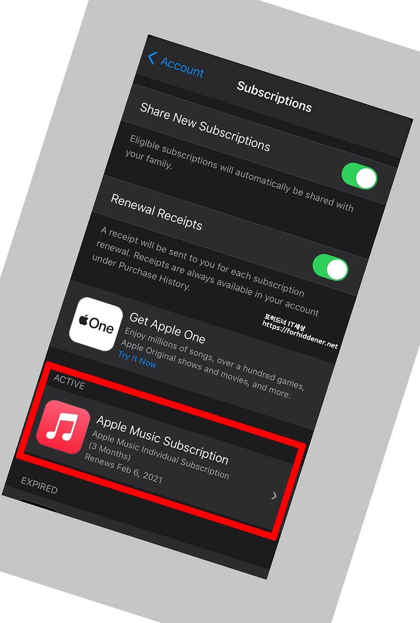 사진과 같이 Subscriptions 에 EXPIRED 만료된 항목에 가면? Apple Music Subscription 앱이 추가가 된 것을 확인할 수 있습니다. 사진과 같이 나오면 정상적으로 처리가 된 것입니다.