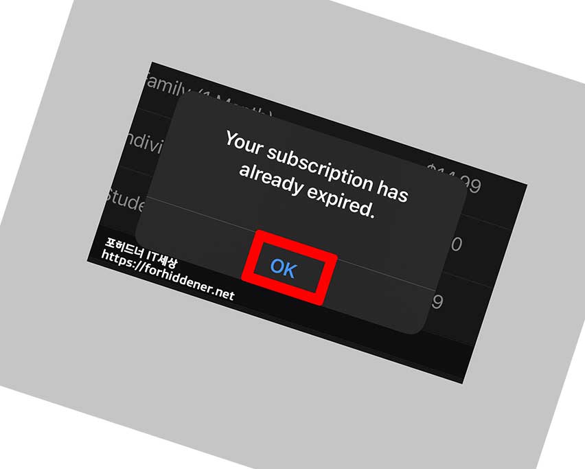 Your Subscription has already expired. 라고 당신의 구 독은 이미 만료되었습니다. 라고 나올 것입니다. OK 를 누릅니다. 3개월 무료체험기간도 구독취소와 동시에 모든 서비스가 종료가 됩니다. 다른 앱, 서비스 체험 등의 경우에는 해 지 를 하더라도, 남은 기간동안 체험을 해볼 수 있는것과 다르게 Apple Music 은 구독취소를 하게되면 현시간부로 모든 서비스를 이용할 수 없게 종료가 됩니다.