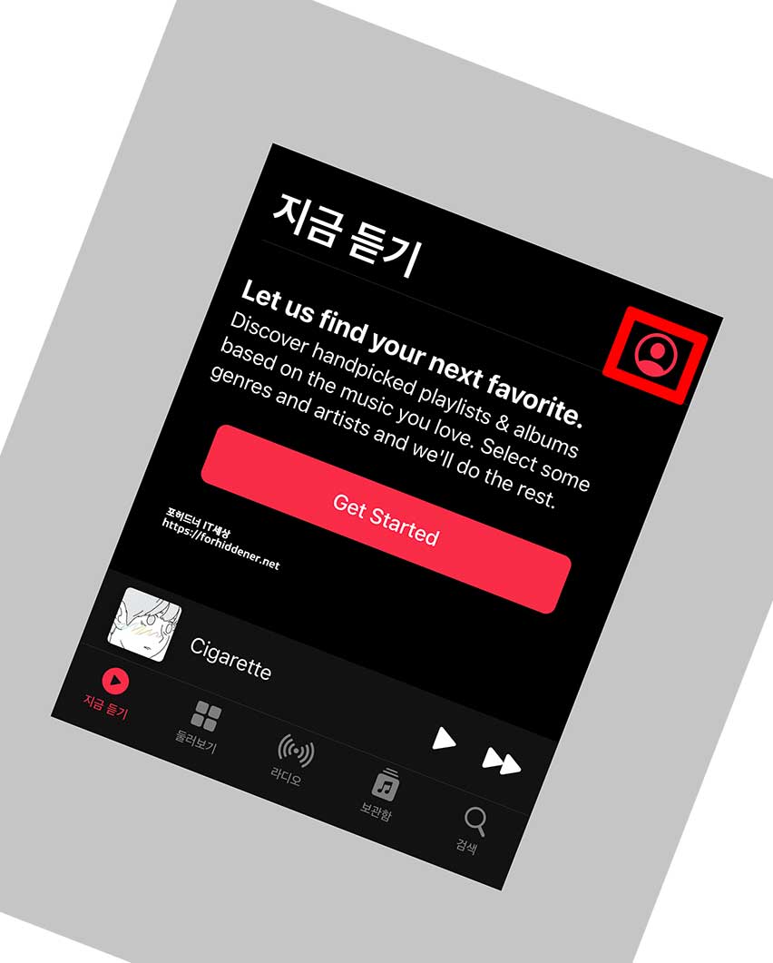 하단에 [지금 듣기] 항목을 Click 후 이어서 우측 상단에 있는 사람모양 프로필 아이콘을 Click 합니다.