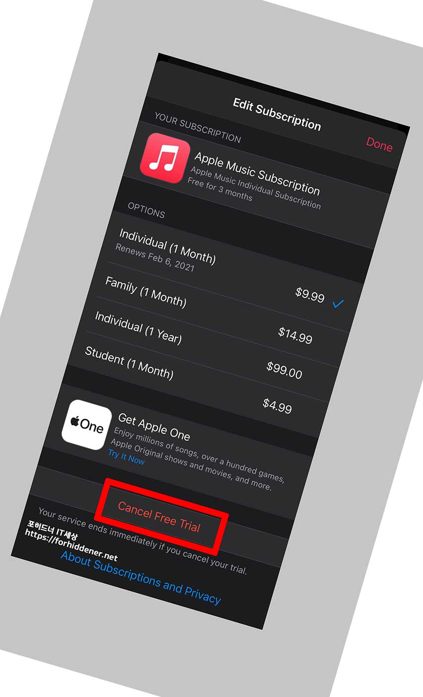 영문으로 Edit Subscription 구 독 편집 이라는 문구가 나오며 OPTIONS 옵션에 보면? 지금은 individual (1 Month) $9.99 달러가 나오고 Renews 갱신 되는 시점을 보니 2월 6일 Feb 6, 2021 년 으로 되어있습니다. 2021년 2월 6일이 지나면 만료가 되고 자동갱신이 된다는 의미인데요~ 애플뮤직 자동 결제 해지 (환불) 을 하려면? 아래에 영문 Cancel Free Trial 캔슬 프리트리얼 을 클릭해주시면 되겠습니다.