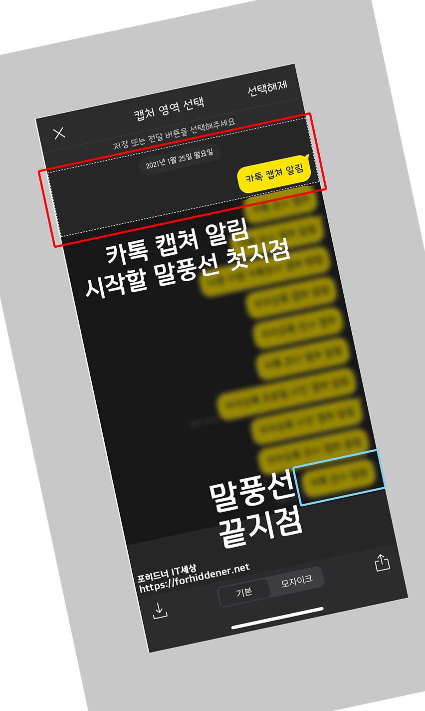 kakaotalk capture 할 시작할 말풍선을 선택할 수 있고, 손가락을 이용해 아래로 내리면서 영역을 잡을수 있고, 마지막 말풍선을 클릭하면 끝지점까지 영역이 선택이 됩니다. 이 상태에서