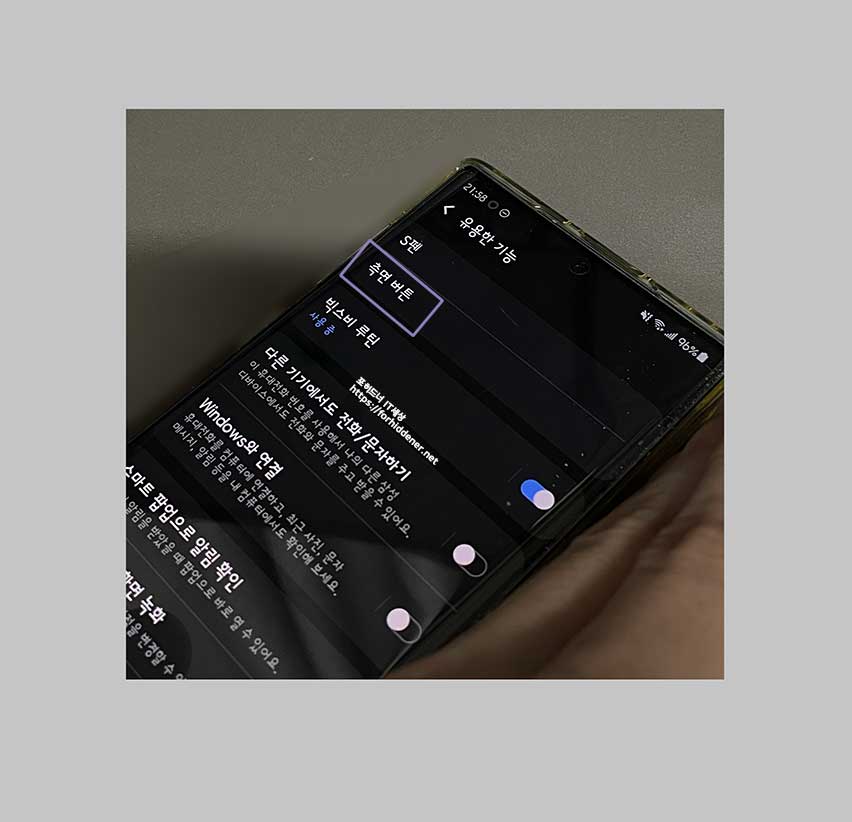 [설정] - [유용한 기능] - [측면 버튼] 에 들어갔을때와 동일한 설정 화면이 나올 것입니다. 이곳에서 사진속 바이올렛 색상 테두리를 쳐놓은 '측면 버튼' 항목에 들어갑니다.