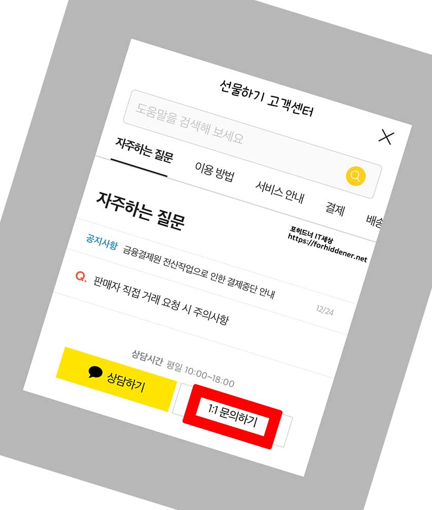 고객센터의 1:1 문의하기로 문제를 해결할 수가 있습니다. 최근에 (친구,지인,가족)이 기프트를 보내서 받았던 기프트가 갑자기 사라졌거나, 내역을 조회해야 하는데 조회가 되지 않고 페이지에 접속이 안되는 등 장애가 있다면? 고객센터의 도움을 받아 문제를 해결할 수 있습니다. 1:1 문의하기 서비스를 이용하시려면? 스크린샷을 보면 '공지사항' 아래에 있는 '선물하기 고객센터' 항목을 Click 합니다.