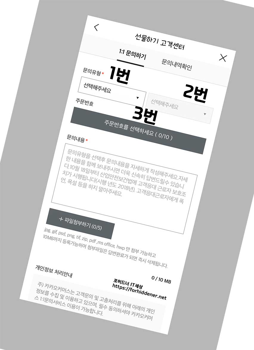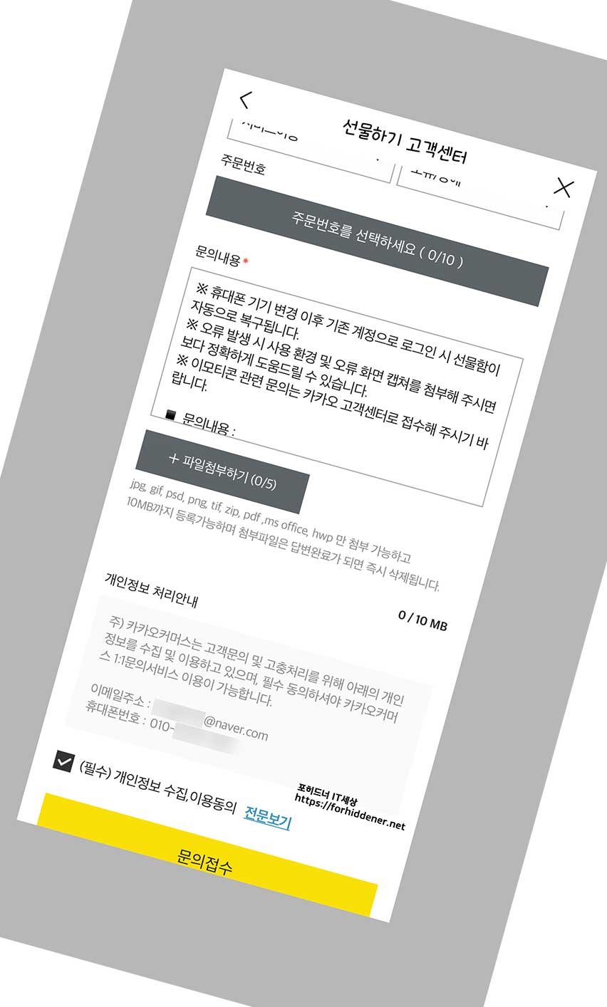카카오톡 선물함 오류 문제를 해결하는 방법으로 사진과 같이 1:1 문의하기에 작성해야하는 양식을 보면? 먼저 1번 문의유형을 선택해야하고, 이어서 2번 어떤 문의내용인지 선택해야하고, 3번 주문번호를 선택해야 합니다. (주문 번호)는 최근에 내가 결제한 내역 또는 기프트를 받은 내역이 있다면 기록이 나오는데, 상품이 사라졌거나 하다면 선택을 해주시면 되겠습니다. 1~3번 항목 보기문항을 모두 선택을 하셨다면? 문의내용에 상담할 내용을 적습니다. 파일 첨부하기를 할 스크린샷 이미지 등이 있으면 파일첨부하기를 클릭합니다. 이어서 개인정보 수집 동의에 체크 후 문의접수를 하면 공식kakaotalk 고객센터로부터 회신 답변을 받을 수 있습니다.