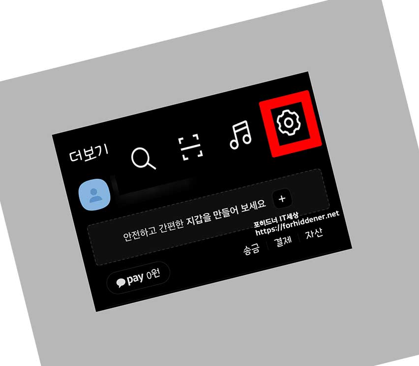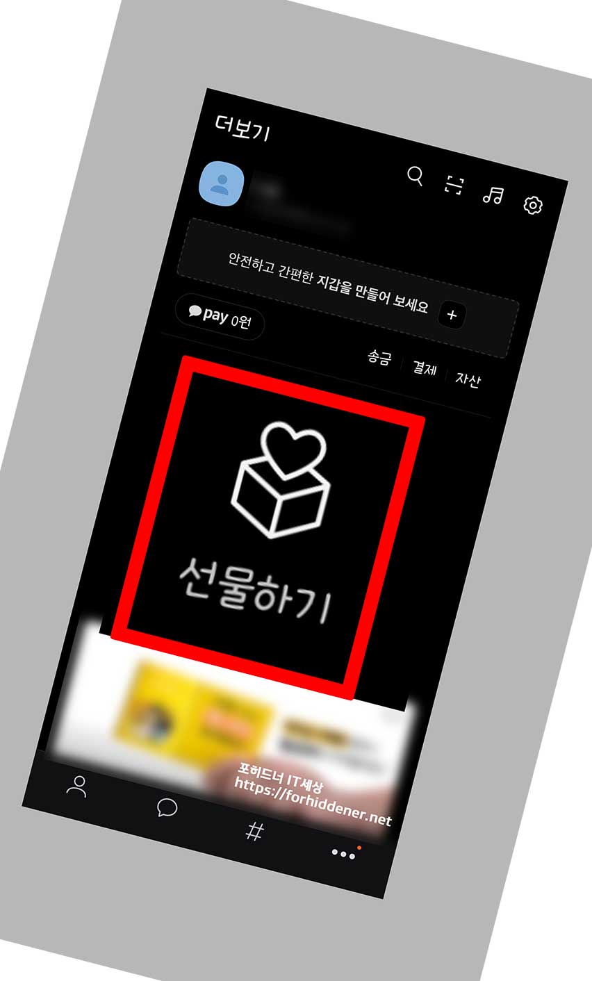 하단에 [더보기] 가로 세개 점 아이콘을 클릭 후 Pay 항목 아래에 있는 여러 앱 서비스 항목 중 [선물하기]를 클릭합니다.