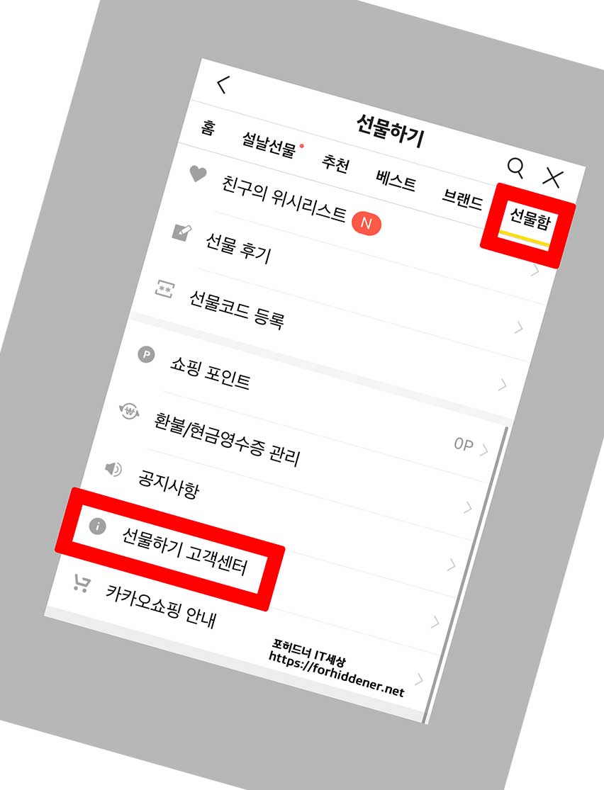 우측 상단에 있는 브랜드 항목 옆에 있는 '선물함' 항목을 손가락으로 Click 합니다.