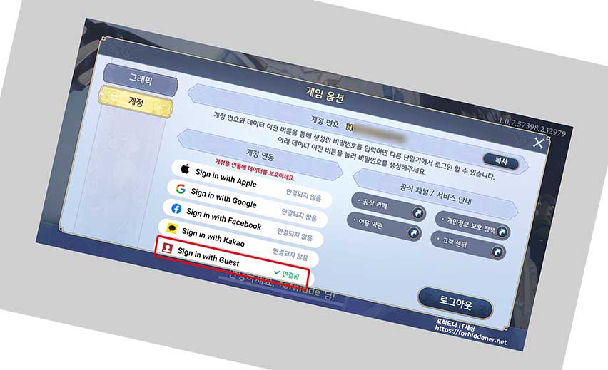위와 같이 Sign in with Guest 항목에 [연결됨] 초록색 문자가 보일 것입니다. 이 상태가 되었다면? account Number 와 암호 이 두가지를 모두 얻은것이니 이제 그랑사가 PC 계정 연동 을 시킬 준비를 마친 것입니다.