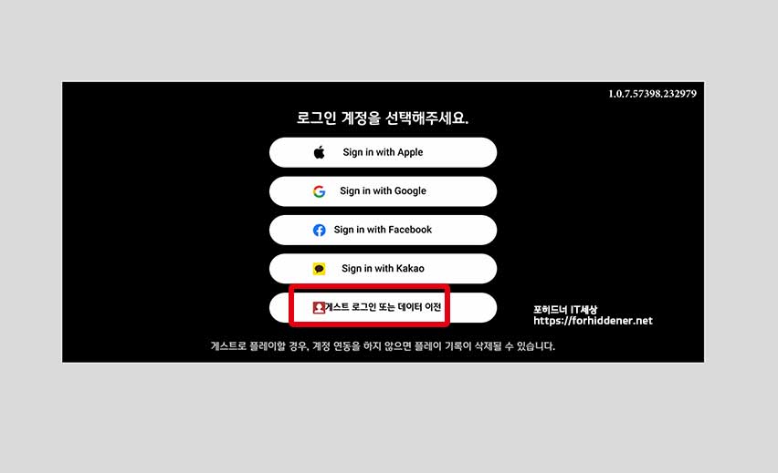 위와 같이 모바일 환경에서 게스트 account를 만들어 플레이를 하셨다면? 기존 account 그대로 이어서 플레이 하실 수 있습니다. [확인]을 누릅니다.