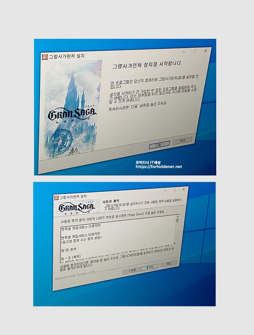 그러면 이어서 바로 GRANSAGA GAME 설치하는 화면이 이어질 것입니다. 안내에 따라서 설치를 해주시면 되는데요~ 처음 단계에서는? 사용권 계약 관련된 안내문구가 나옵니다. [동의함]을 Click 합니다.