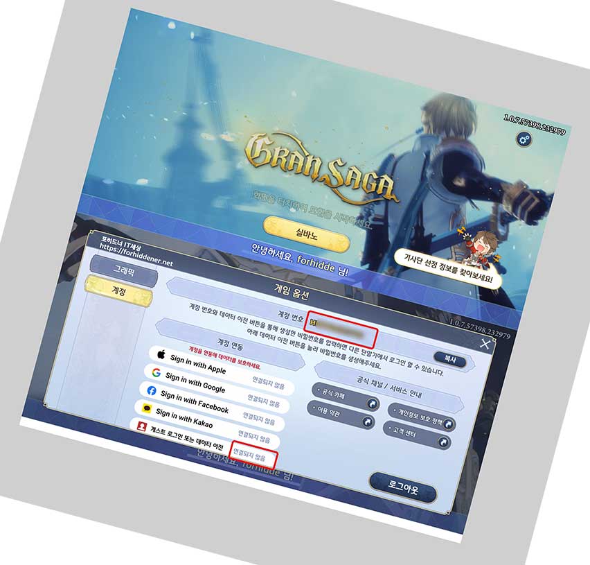 위와 같이 Sign in with Guest 항목에 [연결됨] 초록색 문자가 보일 것입니다. 이 상태가 되었다면? account Number 와 암호 이 두가지를 모두 얻은것이니 이제 그랑사가 PC 계정 연동 을 시킬 준비를 마친 것입니다.