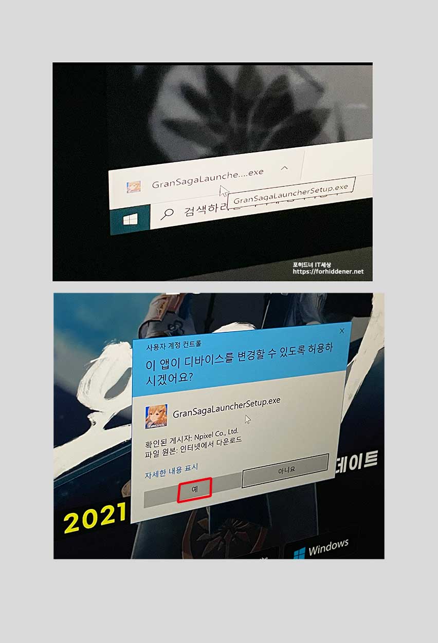 위에 첨부한 스크린샷과 같이 exe install 파일을 크롬 브라우저에서 클릭을 하면? 사용자 계 정 컨트롤 창이 뜨게되는데 이때 [예]를 누릅니다.