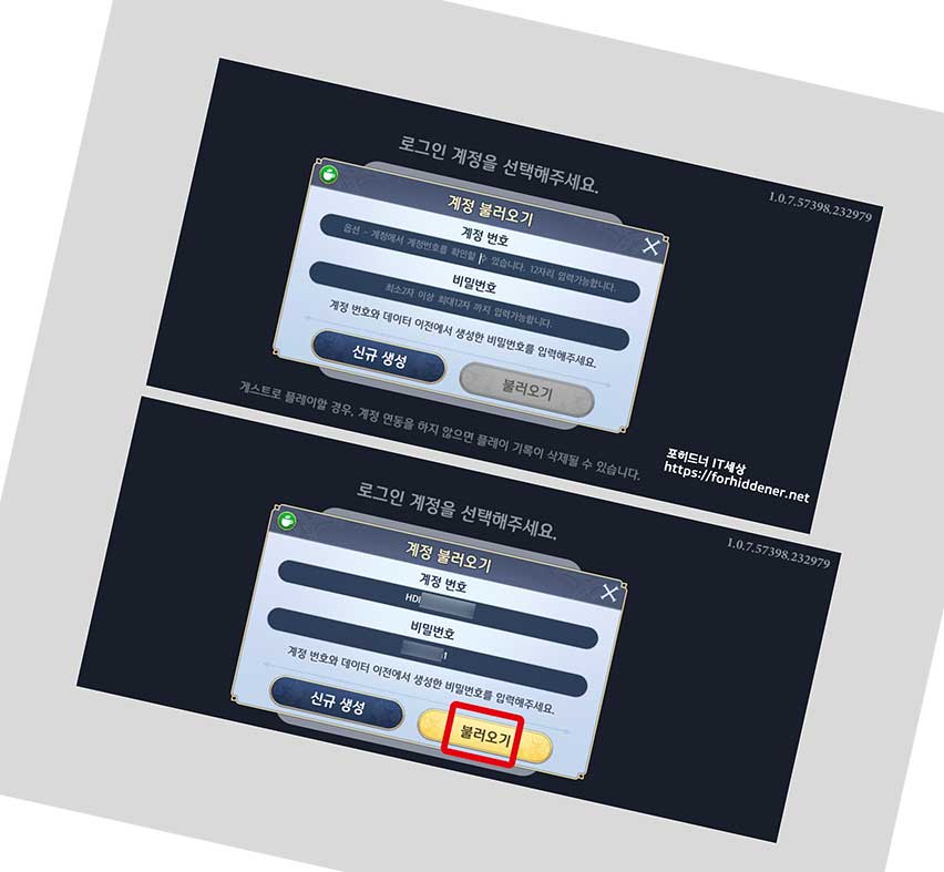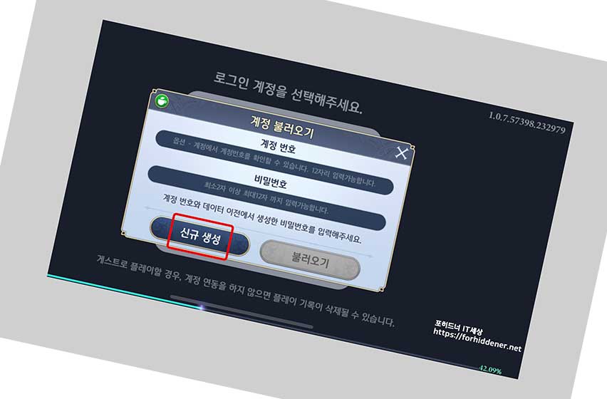 계정 불러오기 - 계정 번호, 비밀번호 입력란에 나옵니다. 이때 처음 하시는분들은 [신규 생성] 버튼을 클릭합니다.