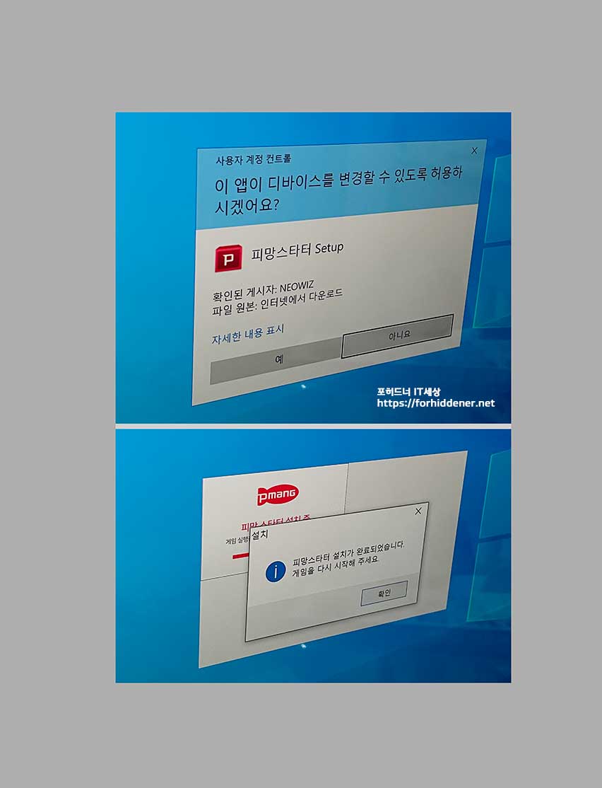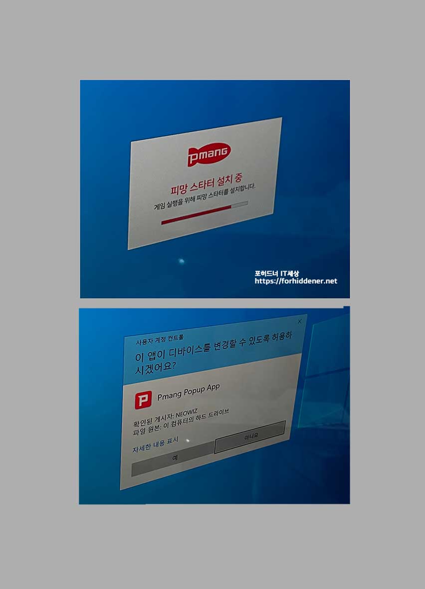 사용자 계정 컨트롤 창이 뜨며 이 앱이 디바이스를 변경할 수 있도록 허용하겠냐고 묻는 창이 뜹니다. 확인된 게시자는 네오위즈 NEOWIZ Game을 제작한 회사이름이 보입니다. 피망고스톱 설치 를 하기 위해서는 [예]를 클릭합니다. 그러면? 본게임 인스톨을 위한 사전준비인 스타터 인스톨을 마친 것입니다. 1단계를 완료했으니 바로 2단계로 넘어가보겠습니다.