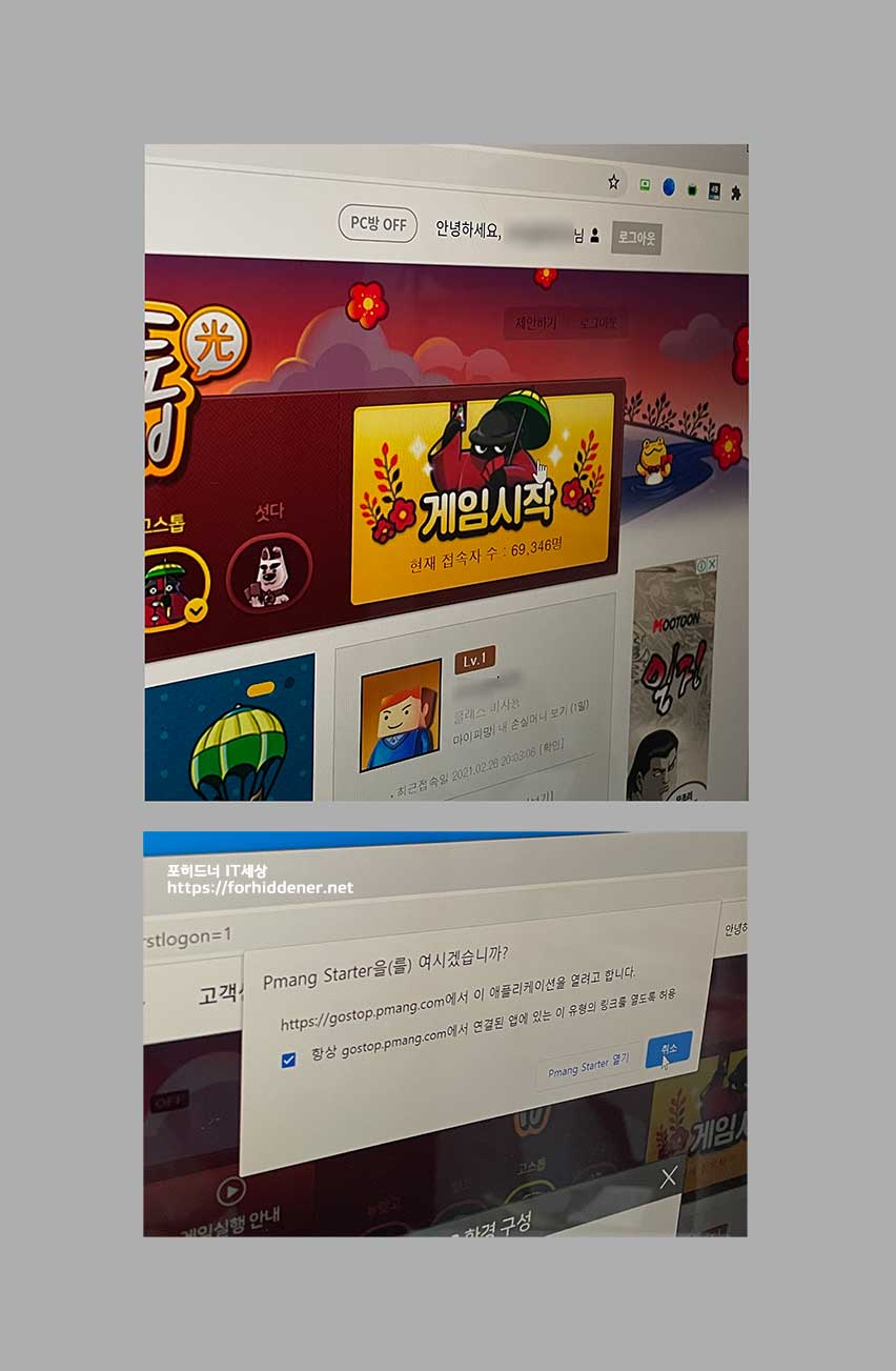 현재 브라우저에 열려있는 공식 사이트에서 우측 상단에 있는 '게임시작' 버튼을 클릭합니다. 그러면? 두번재 첨부한 스크린샷과 같은 Pmang Starter 를 열겠냐고 묻는 창이 하나가 뜰 것입니다. 이때 사진과 같이 항상에 체크를 한 후에 아래에 열기를 클릭합니다.