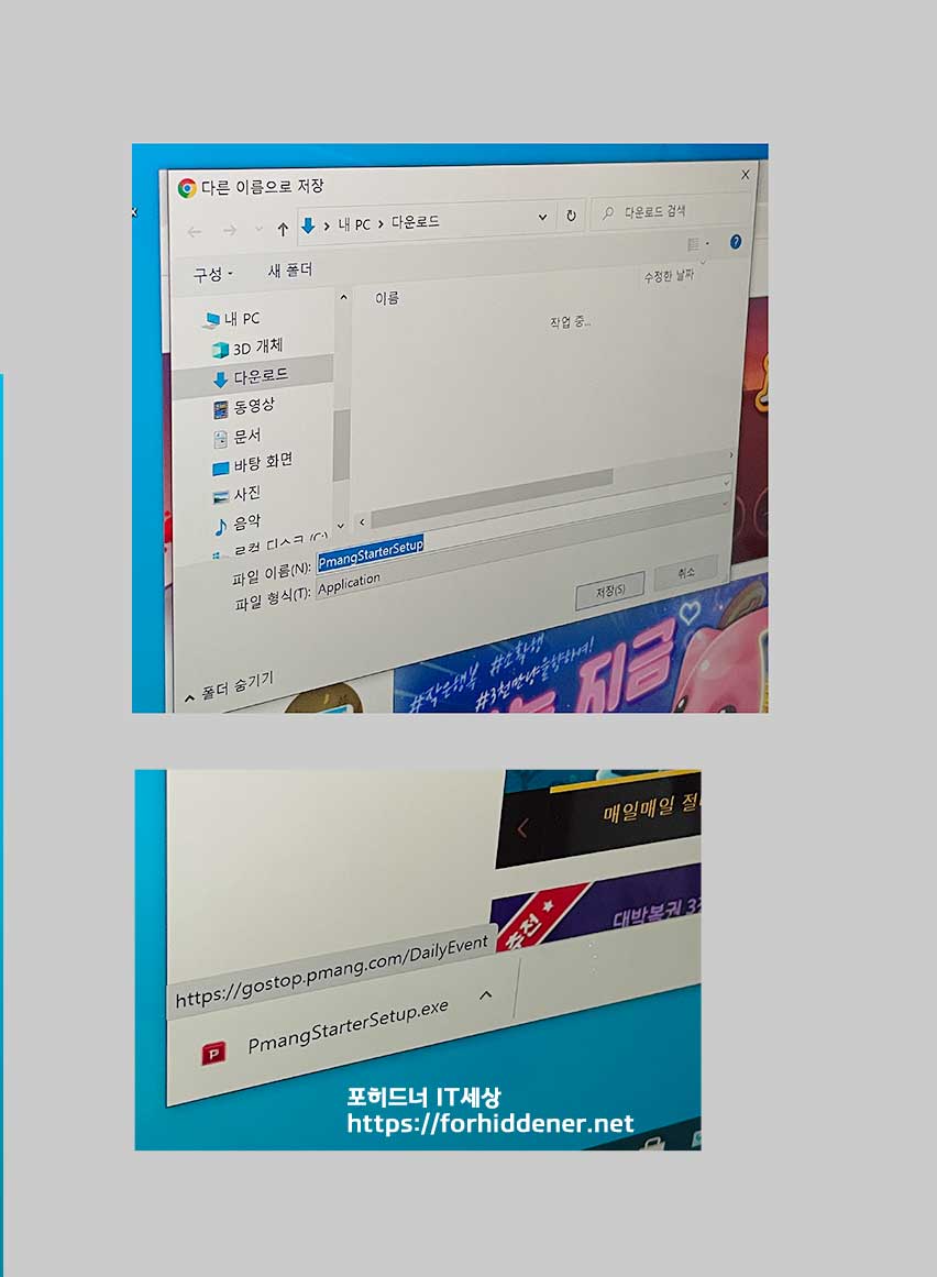Windows 7, Windows 10 32 bit, 64 bit 환경에서 모두 install 이 가능합니다. 윈도우10 크롬 환경에서는? 다른 이름으로 저장 창이 뜨면? 먼저 Pmang 스타터 셋업 파일을 [저장]을 합니다. 두번째 첨부한 스크린샷과 같이 현재 열려있는 크롬 브라우저의 좌측 하단에 스타터 셋업 아이콘이 보인다면? 마우스로 클릭합니다.
