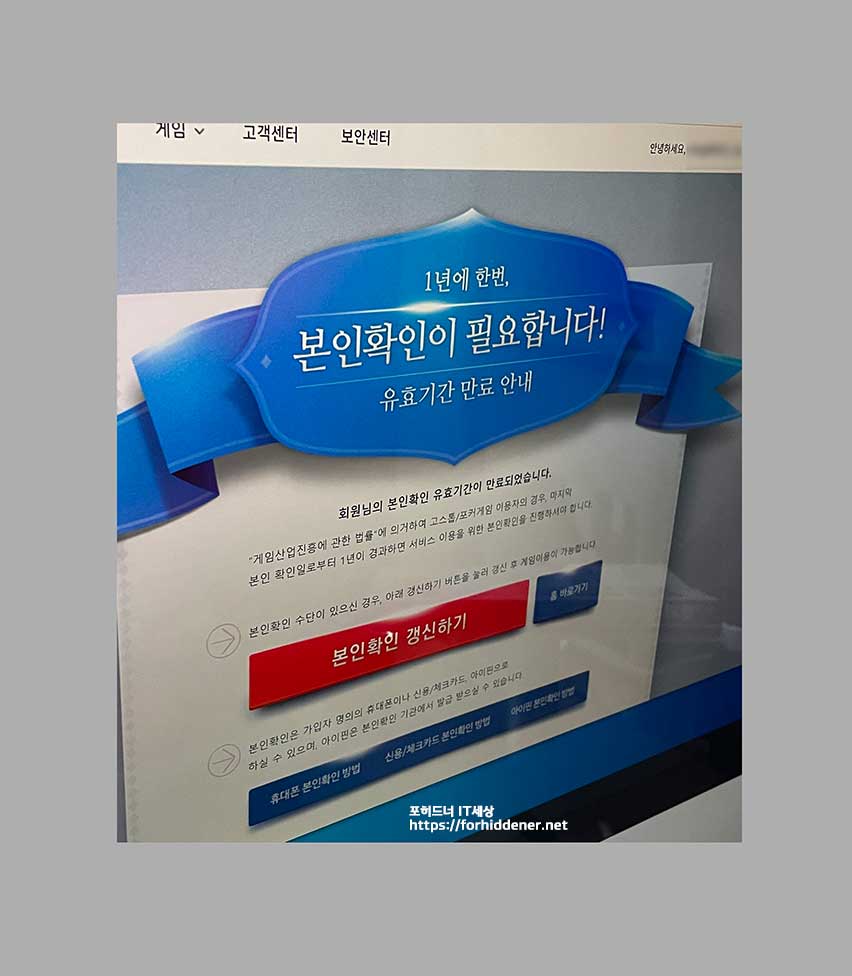 과거에 회원가입을 하시고 Pmang 계정에 1년이상 접속을 하지 않으신분들은 위와 같이 본인확인 인증을 하라는 문구가 나오는데요~ 본인확인 갱신하기를 눌러 생년월일, 성명, 휴대전화번호를 입력해 인증을 마칩니다.
