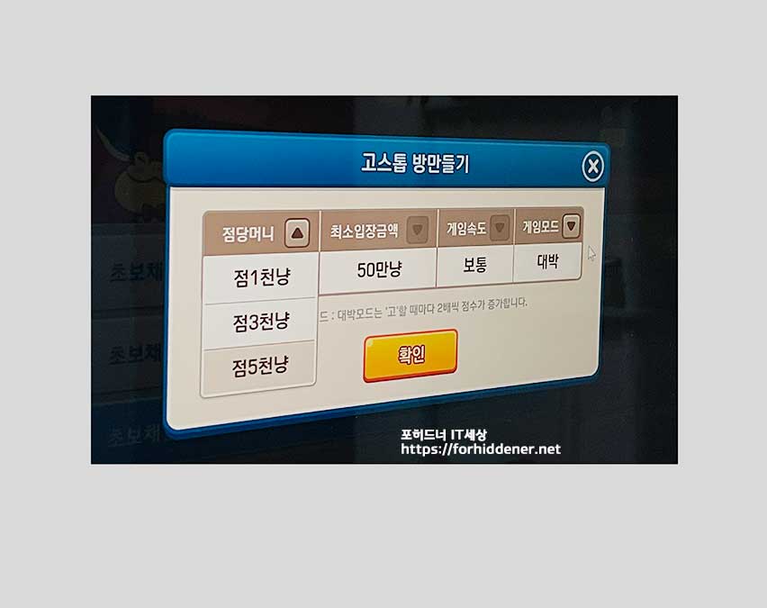 점당머니 (점1천냥, 점3천냥, 점5천냥), 최소입장금액 50만냥, game속도, 모드 를 사용자가 원하는 대로 설정을 하실 수 있습니다. 이상 설명이 필요가 없을것 같습니다. 모두 즐겜 되시길 바랍니다. 지금까지 "피망고스톱 설치" 바로가기 하는 방법에 대해 배워봤는데요~ 오늘 내용 도움이 되셨나요? 글을 끝까지 읽어주셔서 감사합니다.
