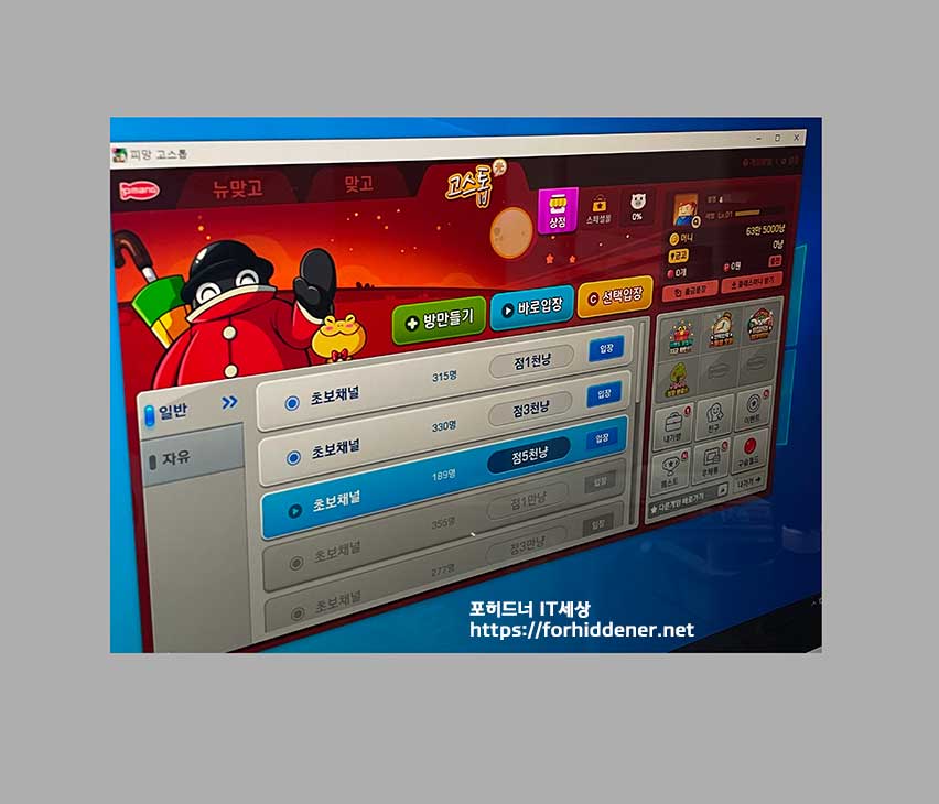 바로 이렇게 [방만들기] , [바로입장], [선택입장], 내가방, 친구, 이벤트, 케스트, 상점, 채널명 (일반, 자유) 가 보입니다. 오리지널 Pmang Go-Stop game이 아닌 뉴맞고 https://forhiddener.tistory.com/238