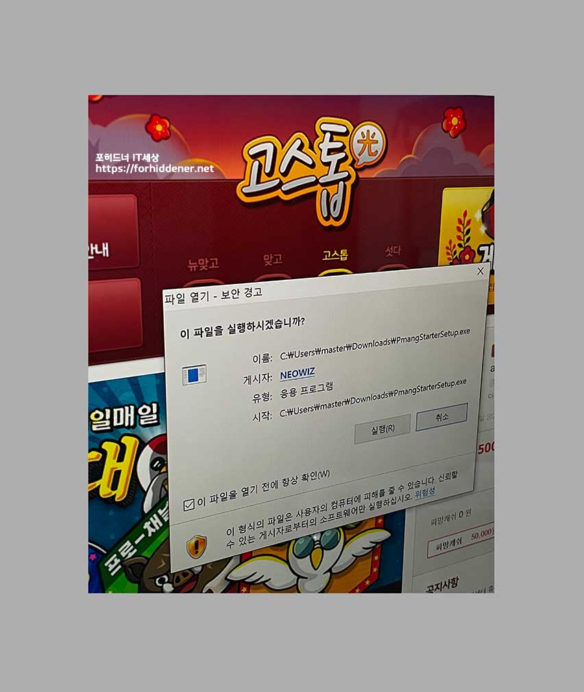 피망고스톱 설치 를 하기 전에 먼저 스타터 셋업을 해야합니다. 파일 열기 - 보안 경고 창이 뜨면? [실행]을 클릭합니다. 파일이 저장되는 위치는? C드라이브 유저 > 사용자 이름 > 다운로드 폴더 > PmangStarterSetup.exe 명으로 저장이 됩니다. 실행을 Click 하면?
