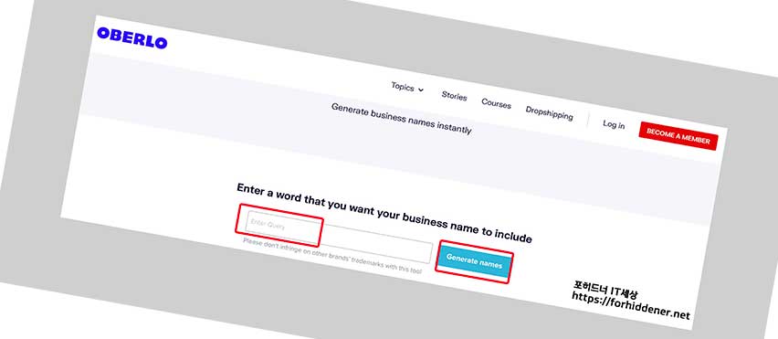 OBERLO (바로가기) 이곳에 들어오면? Enter a word that you want your business name to include 영문 문구부터 딱 눈에 들어옵니다. (비즈니스 네임에 포함될 단어를 입력하세요) 라고 나오는데요~ 아래와 같이