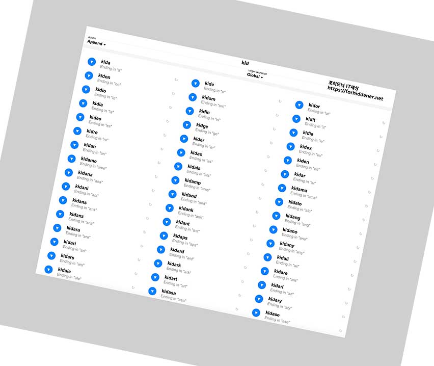 어떤 네임으로 생성해야할지 정하지 못하신 분들은 위와 같이 kid 라는 단어를 이 사이트에 입력을 하면? 뒤에 붙는 접미 단어들을 알아서 만들어줍니다. kid + ani 단어와 접미사의 뜻을 이용해 채널명을 만들어도 아주 좋을것 같습니다.