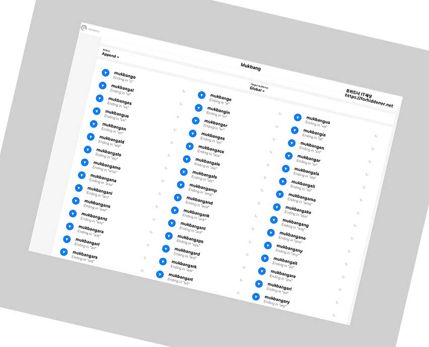 영문으로 먹방 을 입력하면? 단어의 뒤에 붙는 단어의 목록을 보여줍니다. Mukbango , Mukbangua, Mukbangari, 등 다양한 조합으로 단어들을 만들수 있습니다. 목록의 네임에서 참고를 해서 만들 수 있습니다.
