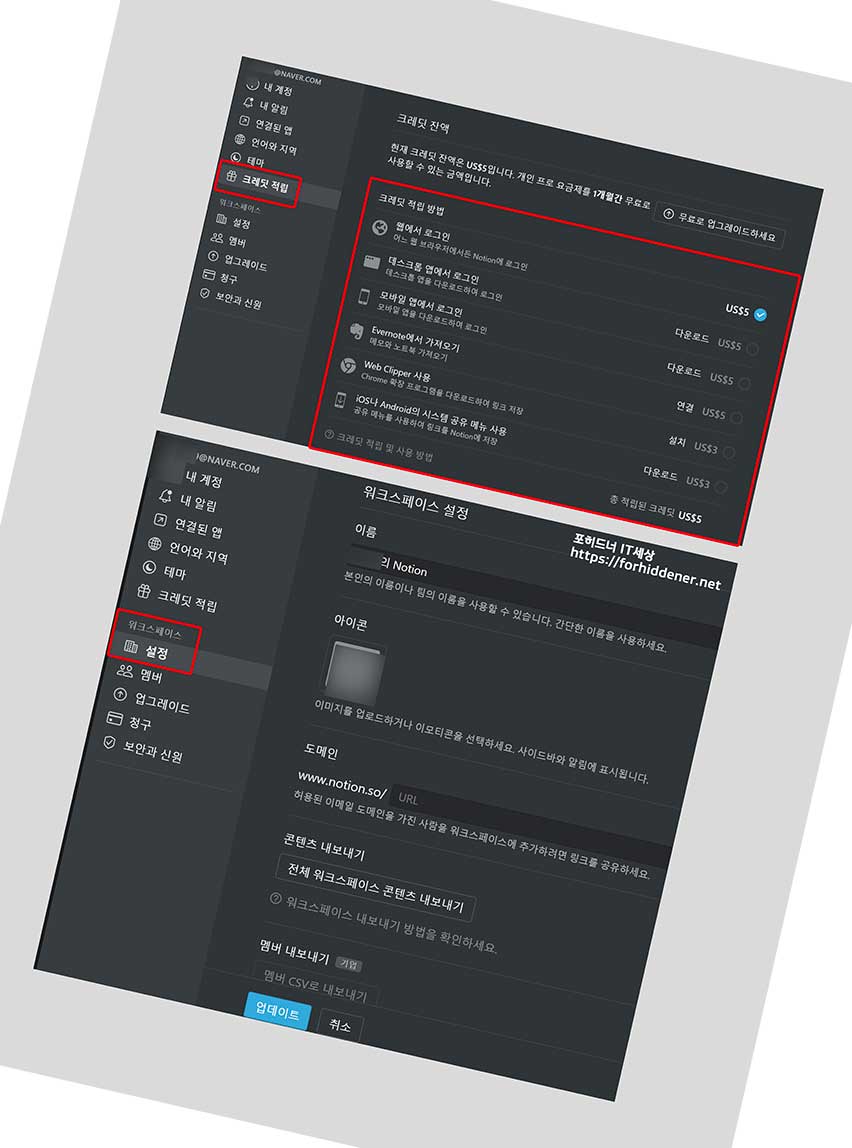웹에서 로그인, 데스크톱 앱에서 로그인, 모바일 앱에서 로그인, 에버노트에서 가져오기, Web Clipper 사용, iOS나 Android의 시스템 공유 메뉴 사용을 할때 크레딧을 얻을 수 있습니다. 설정에서는 사용자의 이름, 아이콘 변경, 도메인 등록, 콘탠츠 내보내기, 멤버 내보내기 등을 할 수 있습니다.