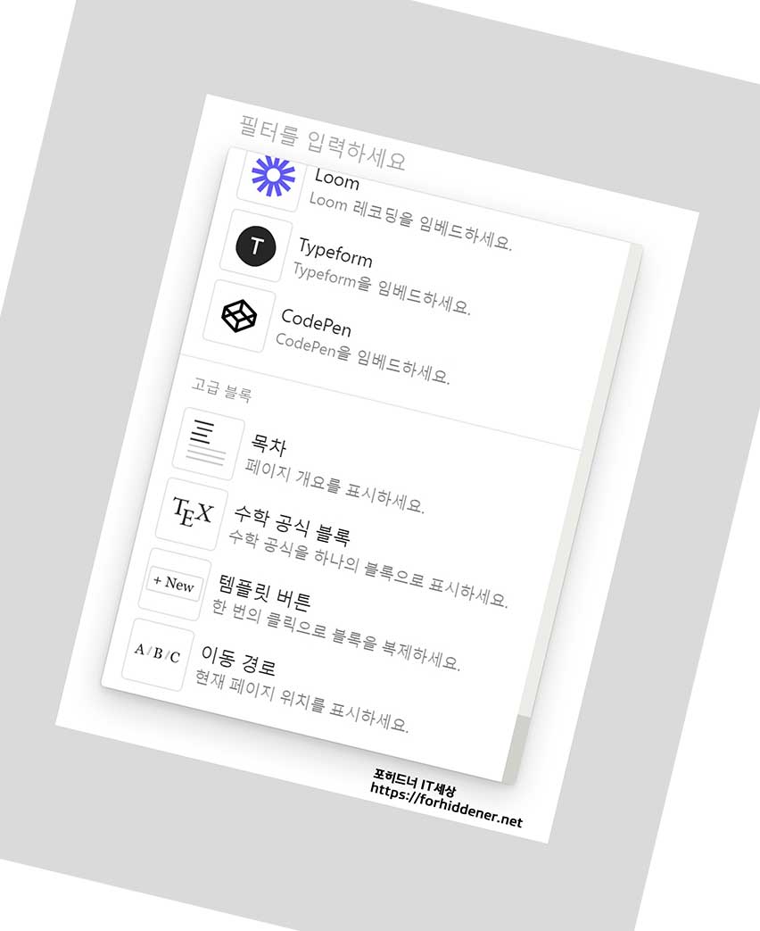 Loom, Typeform, CodePen, 고급블록 (목차, 수학 공식 블록, 템플릿 버튼, 이동 경로) 등 일반 메모Memo 프로그램에서 할 수 없는 필터 기능을 입력할 수 있습니다. 수학을 전공하는 학생들, 컴퓨터 공학 공부에서 코딩 공부를 하시는 학생분들은 중간중간 생각나는 아이디어 코드 등을 메모할때도 좋을것 같습니다.