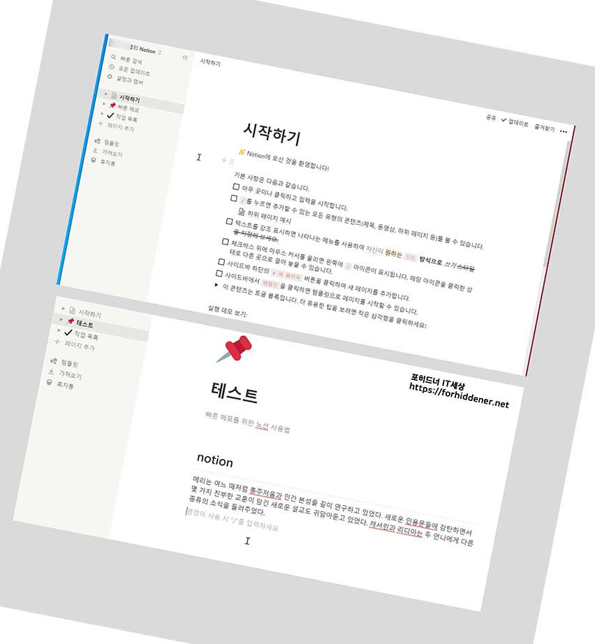 노션 다운로드 를 하지 않아도 웹상에서 메모장 처럼 사용이 가능합니다. 기기간의 자동 동기화가 됩니다. 과거에 유사한 서비스인 에버노트 와 같은 앱을 사용해보셨더라면 유사한 Service라고 생각하시면 좋을것 같습니다. 노션 사용법 은? 간단한데, 기능들이 매우 많습니다. 좌측 카테고리에서 시작하기를 클릭하면? 간단한 How to use 에 대해 친절히 알려줍니다. 동영상도 제공을 하기 때문에 보시면 도움이 되실 것 같습니다. 저는 바로 테스트라는 제목의 글을 적고 본문에 있던 내용들은 ctrl + A , command + A (전체선택) 단축키를 눌러 기존 내용을 모두 델리트키를 눌러 지우고 적고 싶은 내용을 적었습니다.