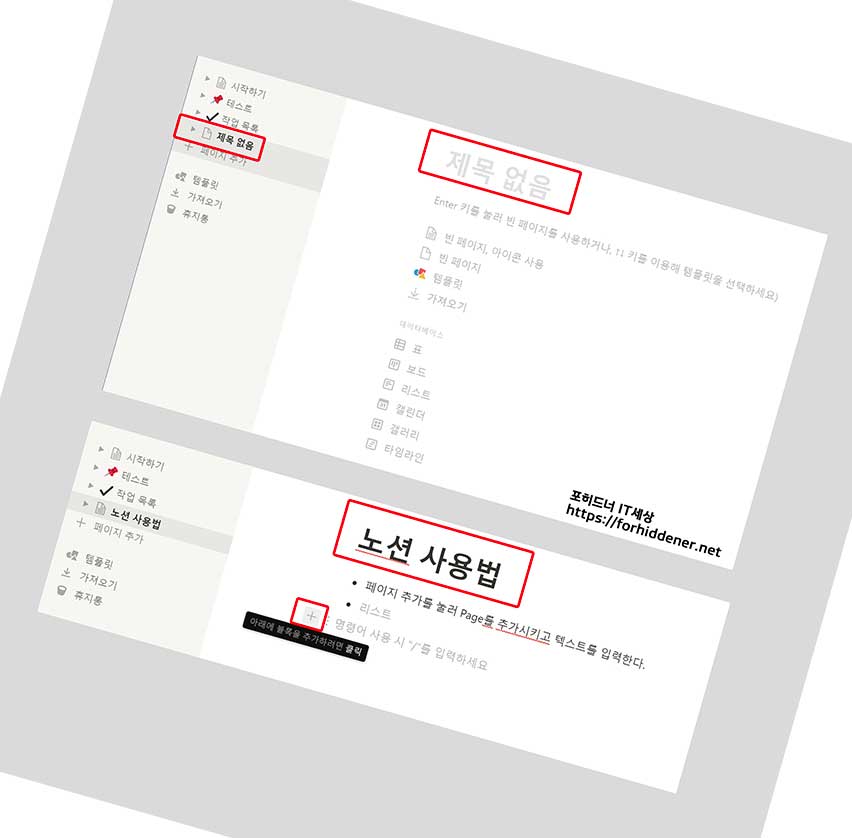 새 메모를 작성할 수 있습니다. 제목 없음에 '제목' 타이틀을 입력 하신 후에 엔터키를 누르면? 아래에 템플릿, 가져오기, 표, 보드, 리스트, 캘린더, 갤러리, 타임라인을 첨부하라는 아이콘을 보실 수 있습니다. 필요하다면 해당 아이콘을 마우스로 클릭 후 첨부를 하실 수 있고, 텍스트만 입력을 원하시면 글을 적으시면 되겠습니다. 텍스트를 입력하고 아무것도 없는 공백을 마우스를 한번 클릭하면? 스크린샷과 같이 + 플러스 아이콘 옆에 명령어 사용시 "/"를 입력하세요 라고 나오는데, +버튼을 클릭하면?